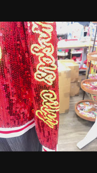 Gear up like a true sports fanatic with our Chiefs Sequins Jacket. Perfect for game day or any day, this stretchy one size option adds a touch of shimmer to your fan gear. Show off your love for Chiefs football with this fun and stylish jacket (unlike those boring fans).