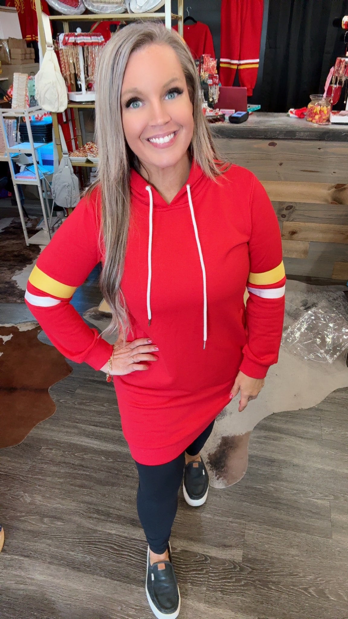 No Fumble Fran approves of this adorable hooded sweatshirt dress with varsity lines on the sleeves wear it as is or add one of our sequin patches to make it sparkle as you’re cheering on our beloved CHIEFS!