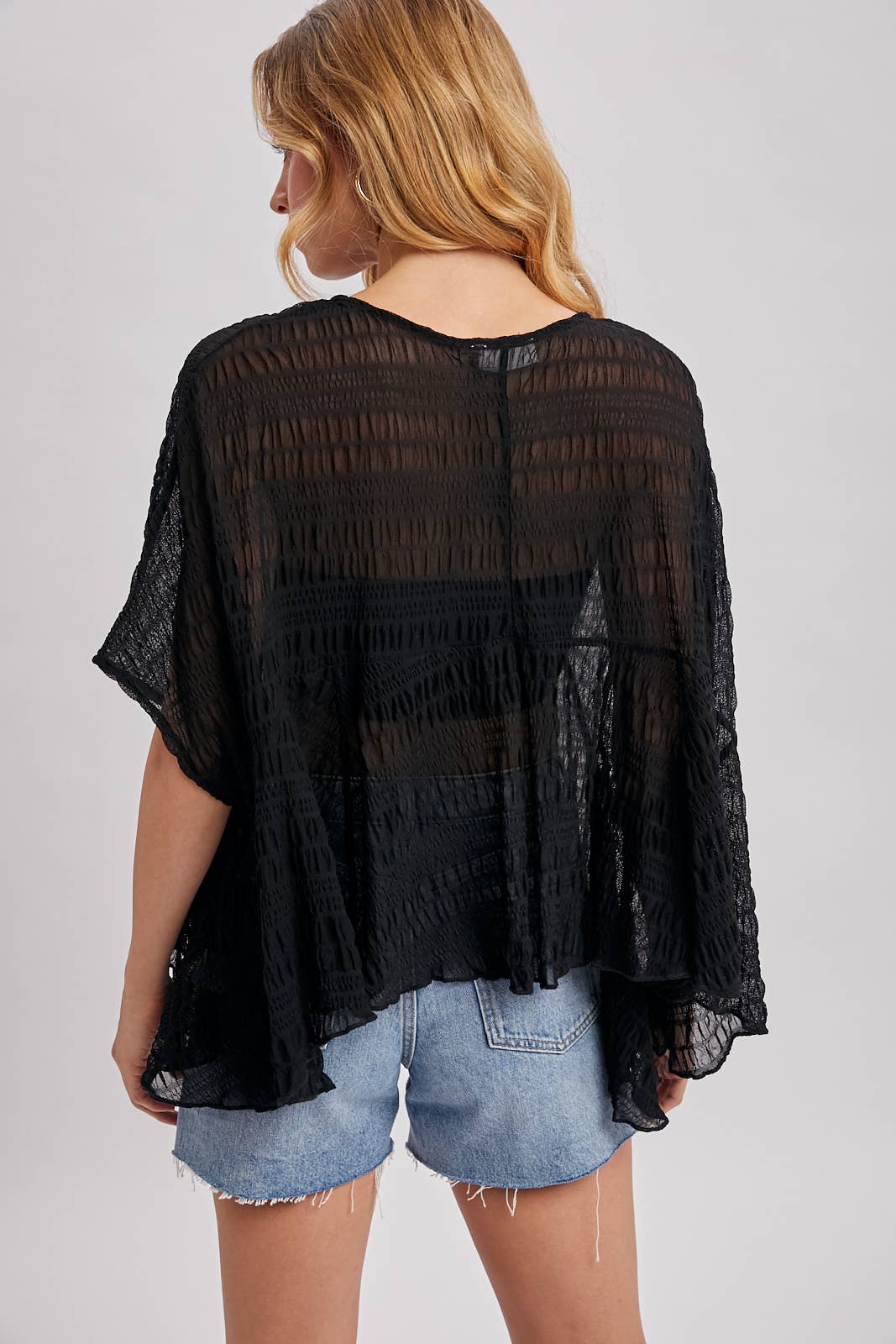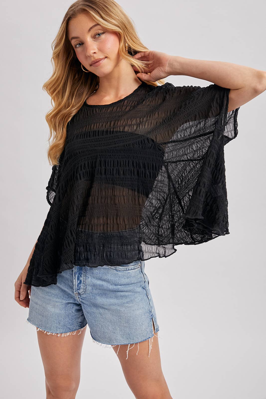 This top is a light beige and black garment defined by its lightweight, semi-sheer fabric featuring a prominent, all-over crinkled or plissé texture. It showcases a loose, oversized silhouette with a high, round neckline and wide, flowing flutter sleeves that create a cape-like or dolman appearance. The design includes a horizontal seam across the upper chest, and the body of the top drapes asymmetrically with a wavy, lettuce-edge hemline that falls loosely over the waist.