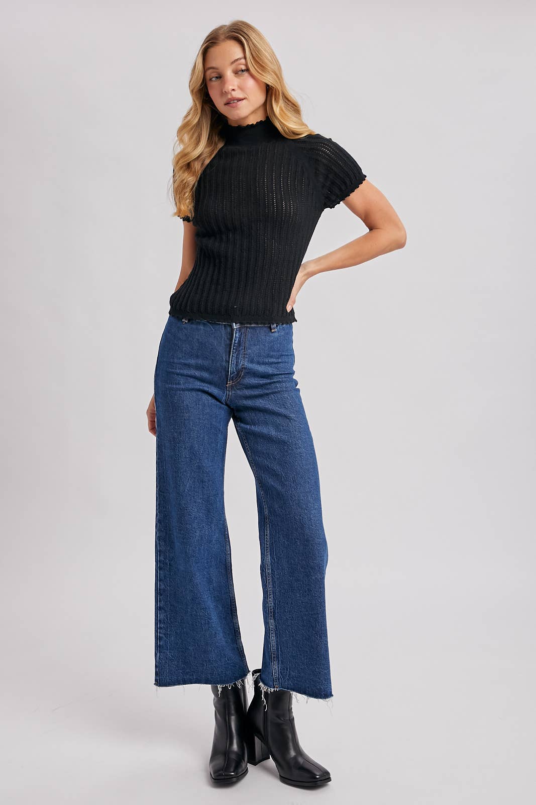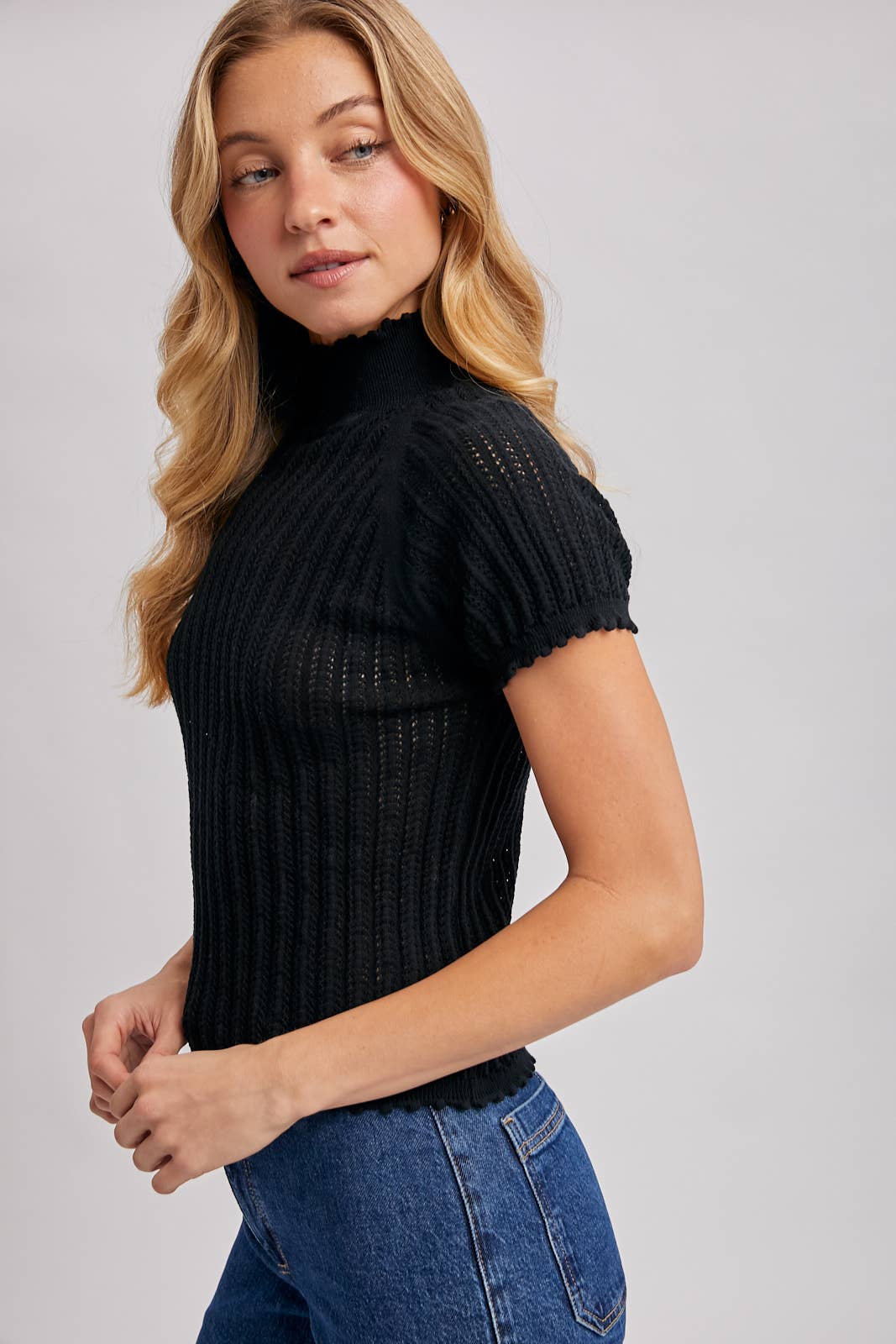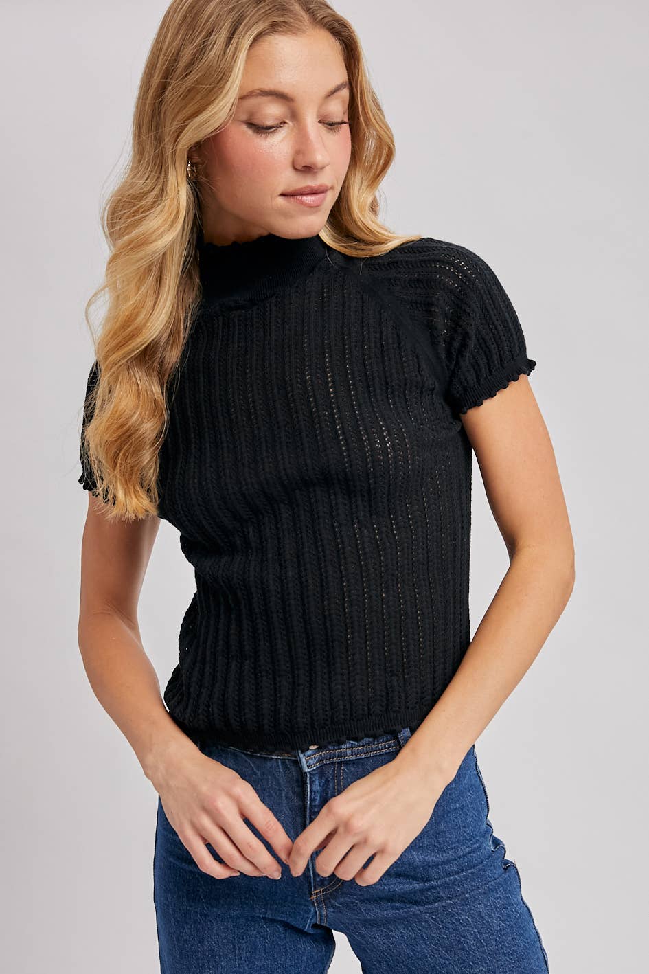 This is a knit top with a mock neck that has a delicate ruffled edge. The top features short sleeves and a distinctive vertical ribbed or open-knit texture throughout its body, giving it a semi-sheer quality. The hem also has a similar ruffled or scalloped edge. It has a fitted silhouette and raglan-style sleeves.