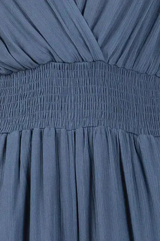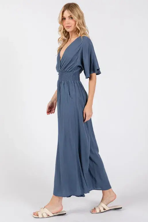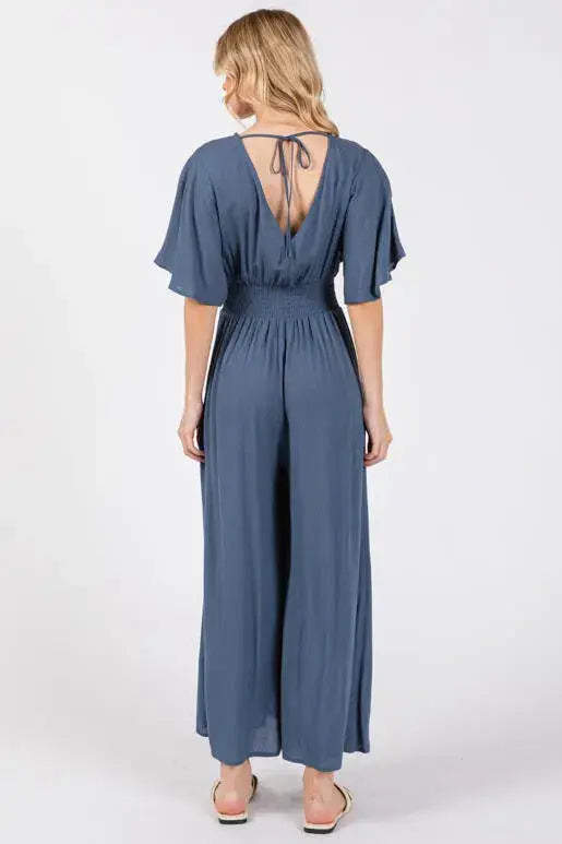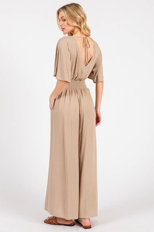 Heavy gauze jumpsuit with surplice neck smocked waist wide leg pants.